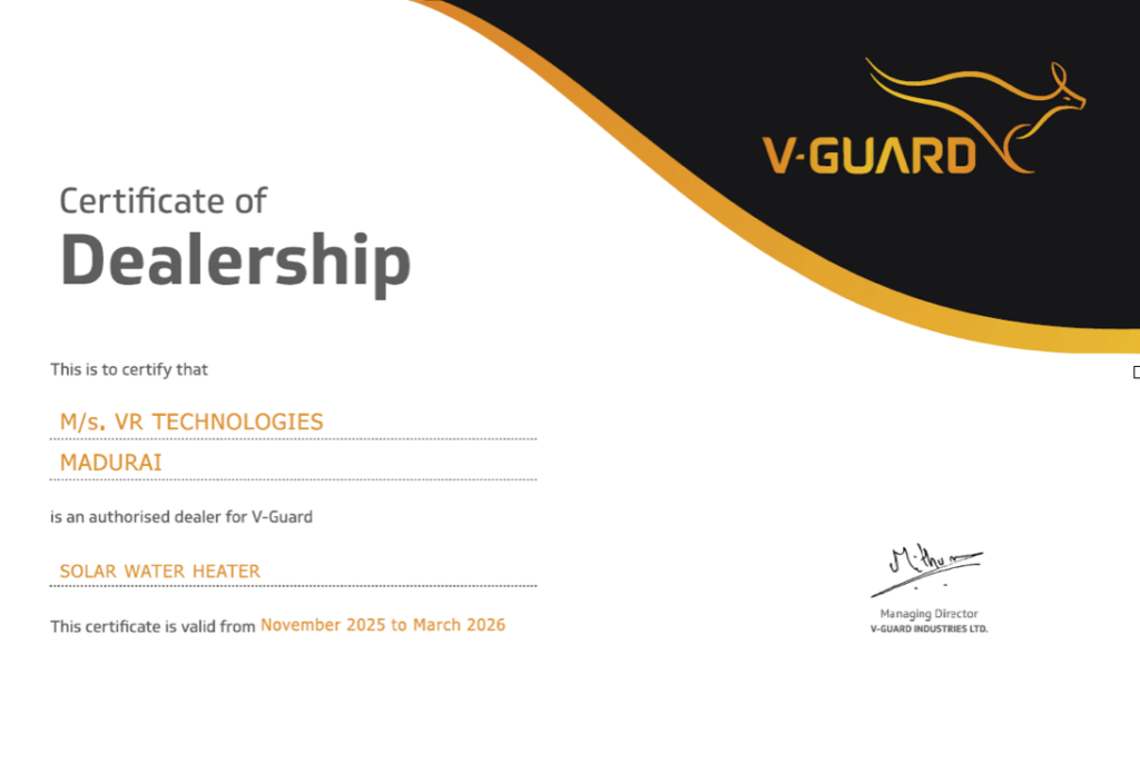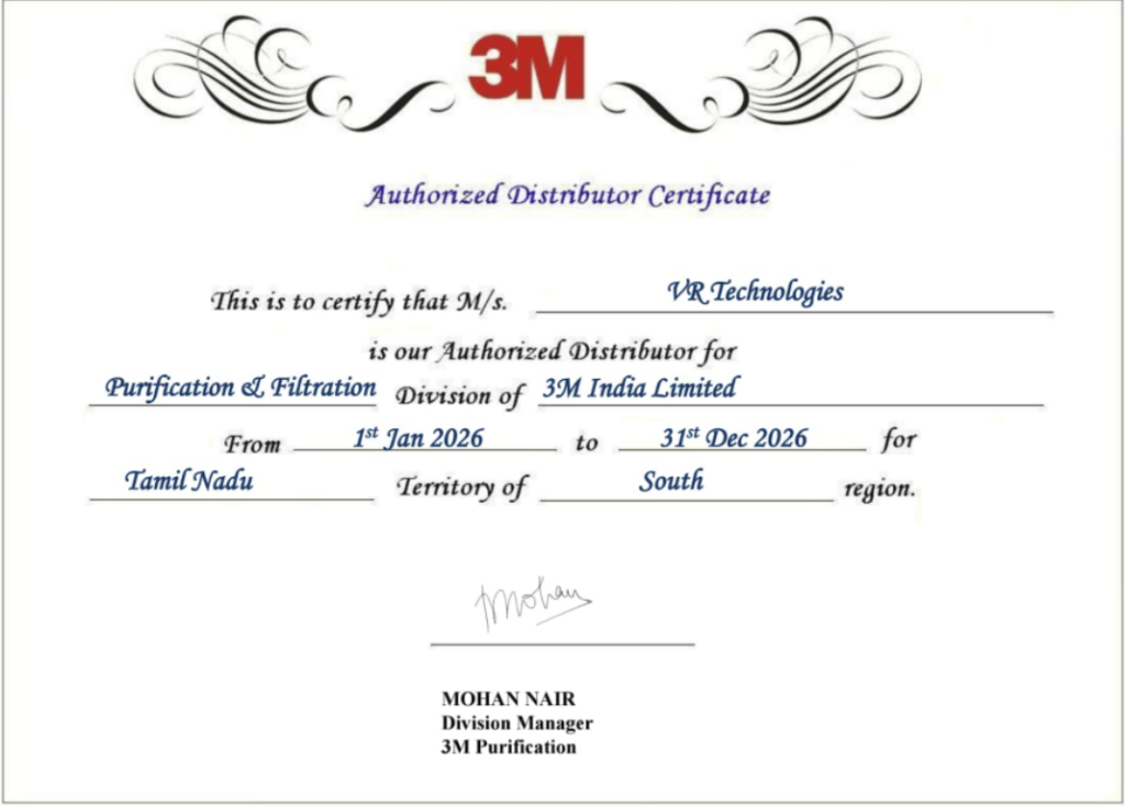 Our journey began with 3M Distribution ship in the year of 2016 June month. 2020 we started our Branch office in Madurai region. Then we covered most of the districts like Pondichery, cuddalore, Villupuram. Trichy, Dindugal, Thirunelveli, Thuthukudi and Kanyakumari through our Dealers. Regarding the brand has unqiue and complete water related products like 3M – Scale Prevention technologies for whole house Hard water products, Sediment removal products up to 5 micron filtration, chlorinie or bad odour removal, Complete automatic and very less maintenance Hard water to soft water (3M SFT200 / WTS range of products) and Iron remover and for safe and pure drinking water for Metro water sources and 3M has launched timely many models like Twin Water softener, Backwash System for Automatic sediments removal and recently launched 3M – VST100 a Bathroom water softner. The VR Technologies team sold more than 2000 customers and more than 3600 units in the past 9 years. Subsequently we are Dealers with Grundfos pump which helps even force all taps and sold more than 200 units. On the business path we are dealers for Kent and Zerob where we sold there Reverse Osmosis unit, which has TDS controller features (maintain the minerals and High recovery systems). IN the year 2025 we are distributors for V-Guard brand for there Heat Pumps and solar water heaters.